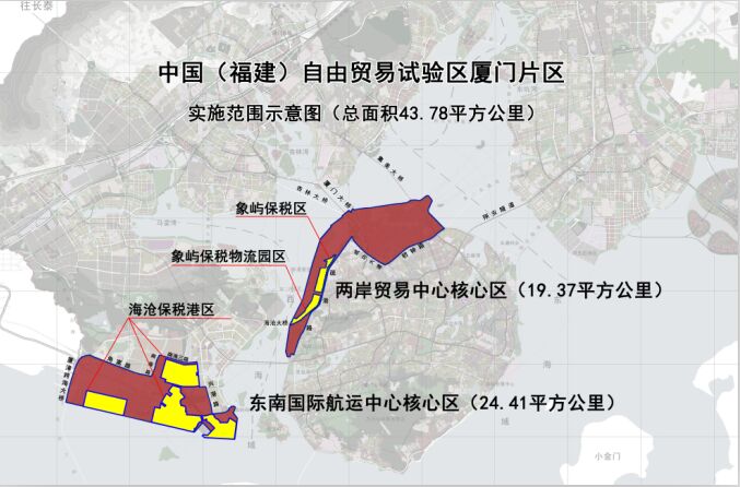 • ?????中國(福建)自由貿易試驗區廈門片區總面積43.78平方公里。包括兩個區塊:兩岸貿易中心核心區19.37平方公里;東南國際航運中心海滄港區24.41平方公里。